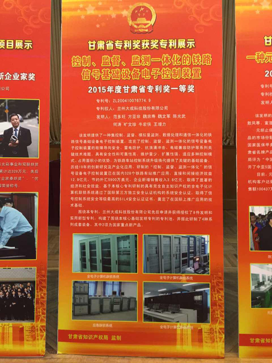 甘肅省首屆專(zhuān)利獎(jiǎng)評(píng)選結(jié)果于2016年2月3日揭曉,我公司“控制、監(jiān)督、監(jiān)測(cè)一體化的鐵路信號(hào)基礎(chǔ)設(shè)備電子控制裝置”發(fā)明專(zhuān)利獲得了首屆甘肅省專(zhuān)利獎(jiǎng)一等獎(jiǎng),位列5個(gè)一等獎(jiǎng)之首。公司董事長(zhǎng)范多旺教授參加甘肅省科學(xué)技術(shù)專(zhuān)利獎(jiǎng)勵(lì)大會(huì)。